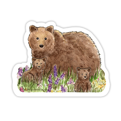 A cute sticker of a brown bear with her two cubs surrounded by purple and yellow wildflowers.