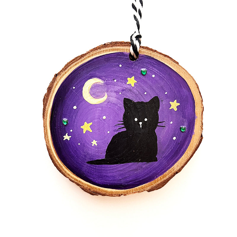 Decorate your Halloween tree with this adorable hand painted ornament. It features a baby black cat with the moon and stars and several green rhinestones. If you don't have a Halloween tree, this would be perfect for Halloween wall decor as well!