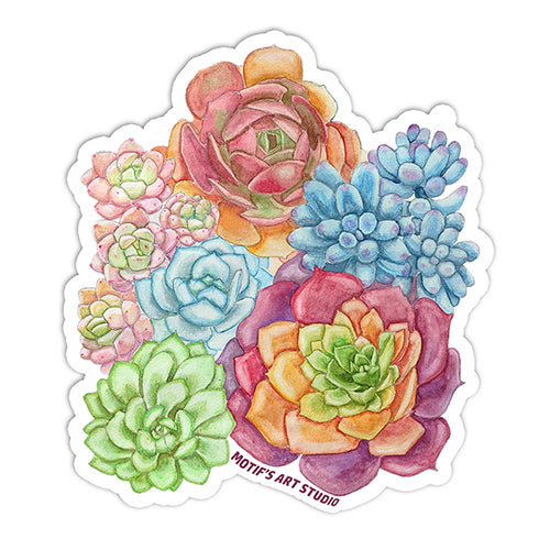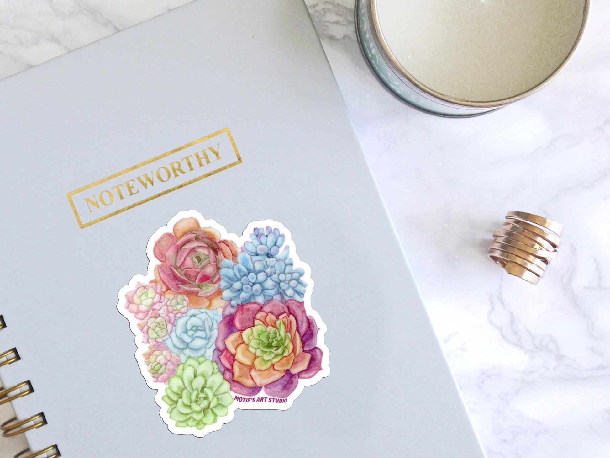 Celebrate the spring and summer with this vibrant succulent sticker. Showcasing 6 different varieties of succulents, this sticker will brighten anywhere you decide to place it!