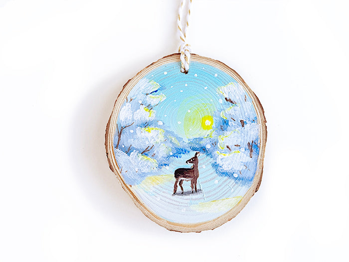 This hand-painted ornament has a sweet deer in the middle of a pathway of a snowy forest. It's sunrise and the tips of the trees and snow reflect the beautiful sun rays.