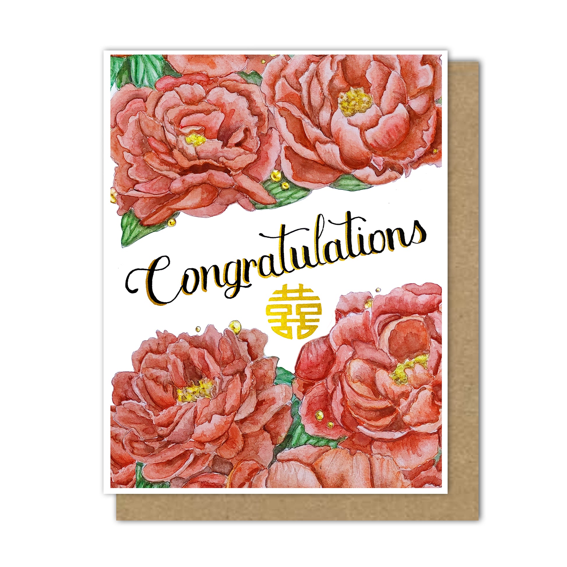 Send congratulatory wishes with this educational "Double Happiness" card. The front of the card showcases red peonies for a prosperous marriage full of love, and the Chinese symbol in gold tops it off by wishing the newlyweds double the happiness!