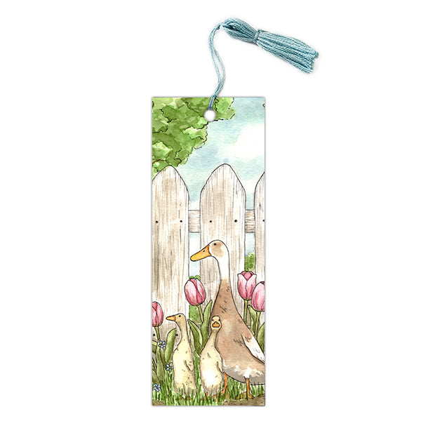 Welcome spring with these adorable runner ducks. This mama duck and her 2 baby ducklings walk a dirt path with pink tulips on a sunny afternoon.