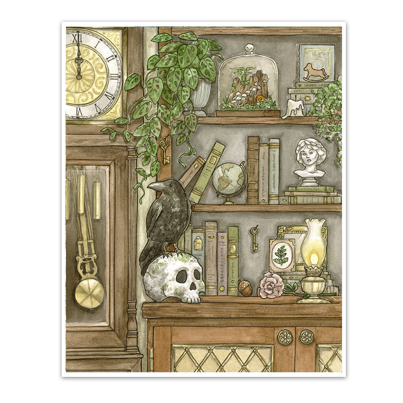 Art print featuring a library full of oddities. Next to an old grandfather clock that strikes midnight, there's a raven that sits atop an old skull. The bookcase behind it is filled with vintage books, plants, and small knick knacks.