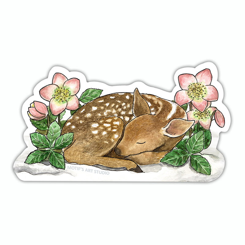 This sticker is of a sweet fawn sleeping in the snow, surrounded by pink "Christmas Roses".