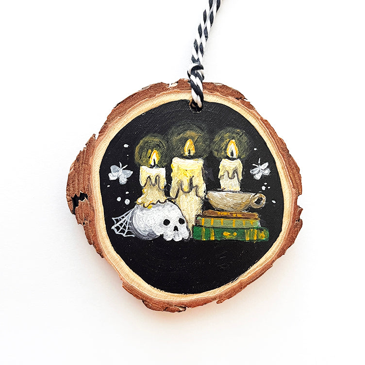 Decorate your Halloween tree with this adorable hand painted ornament. It features a spooky (but kinda cute) skull with glowing candles upon a stack of books. Looks like this skull has been there a while as moths float above and you can see a spiderweb handing on the skull...If you don't have a Halloween tree, this would be perfect for Halloween wall decor as well!