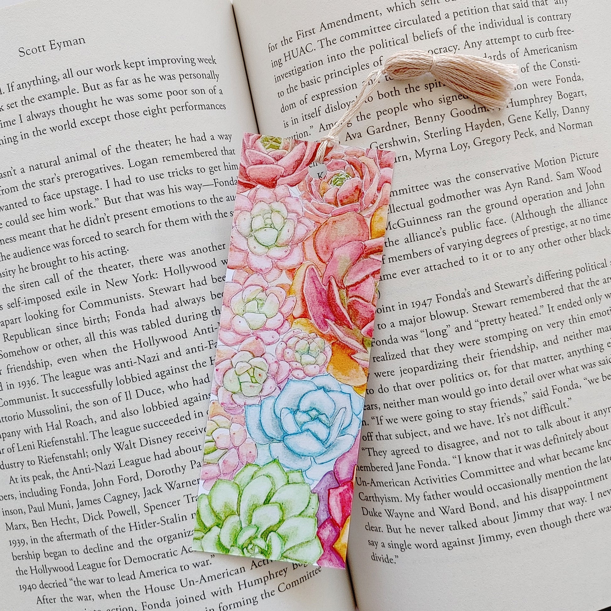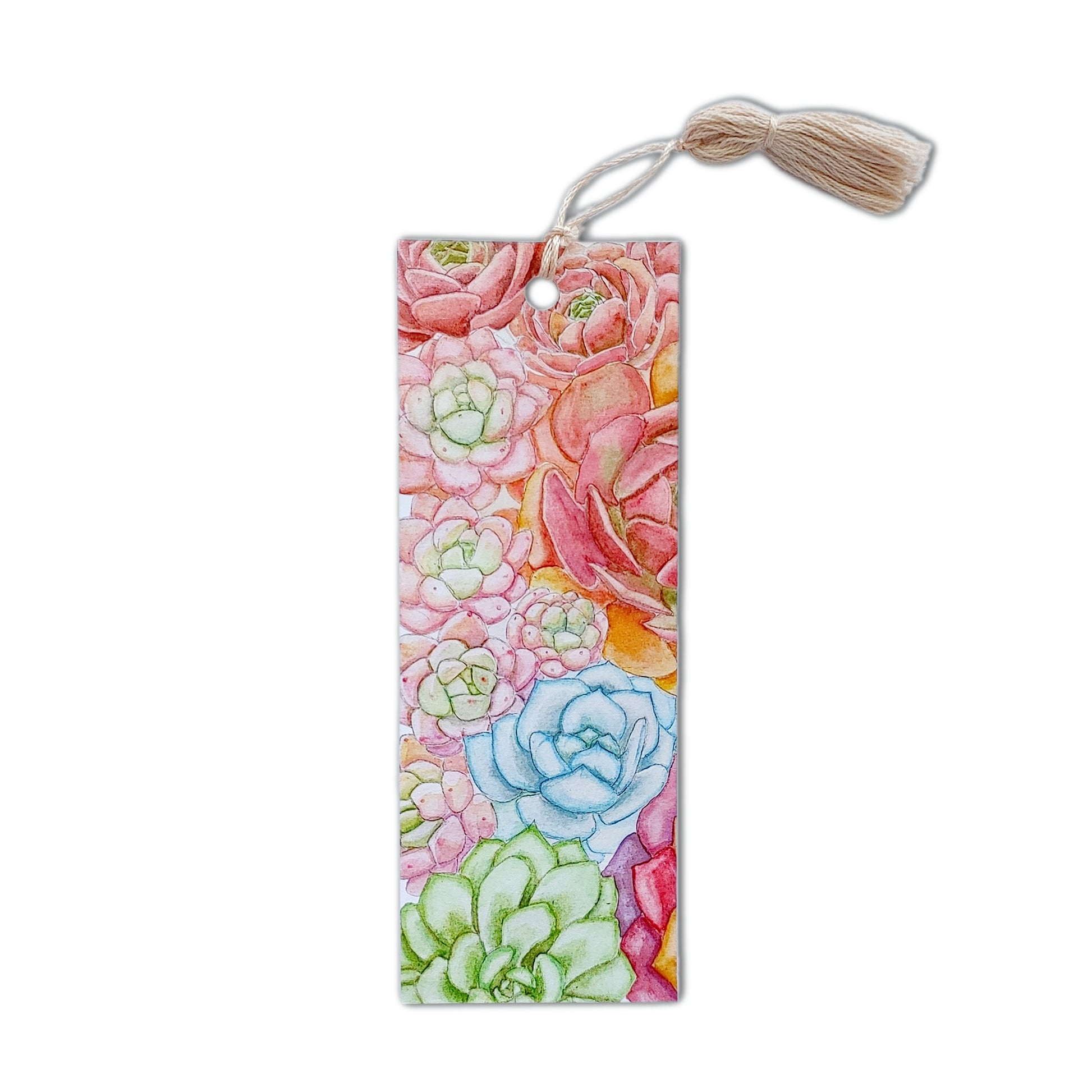 Summery succulents decorate this bookmark, and it will surely brighten your day! The original design is hand painted with watercolor. It's a great gift for a friend or you can treat yourself to a beautiful, decorative bookmark.