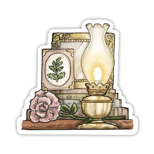 This sticker is of a dark academia themed book arrangement with a glowing oil lamp, a pink rose, a framed fern leaf, and a vintage-style frame.